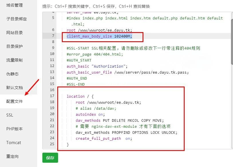 模块安装好之后,就可以配置一个webdav,我们利用宝塔面板来做这件事情还是容易的。