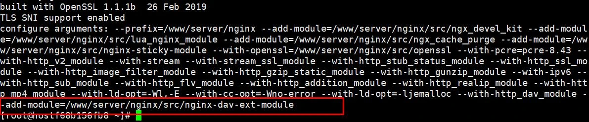 注意:这里的‘V’是大写,我们看到目前的的模块,然后全部复制到一个记事本中备用。然后在最后面添加:”--with-http_dav_module --add-module=/www/server/nginx/src/nginx-dav-ext-module“